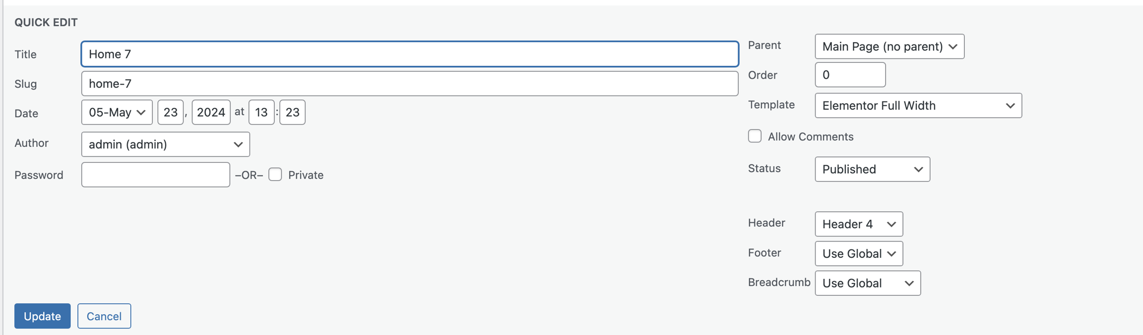 To set a header override for each page, you can either edit the individual page or use quick edit to select the desired header, as shown in the instructional image.